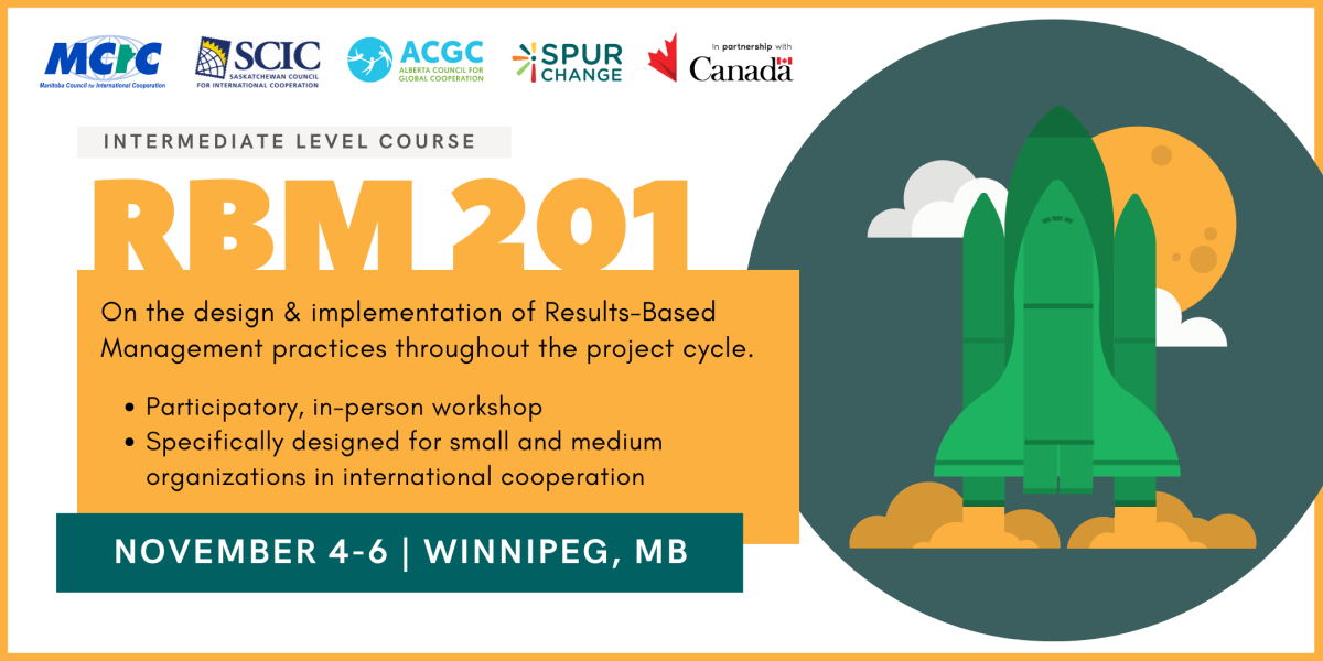Join MCIC, SCIC, ACGC, and Spur Change for a 3-day in-person training in Winnipeg, November 4–6, 2025. This interactive workshop will help nonprofits, charities, social enterprises, and SMOs strengthen their Results-Based Management skills through case studies and practical tools, with a focus on gender equality and the SDGs.